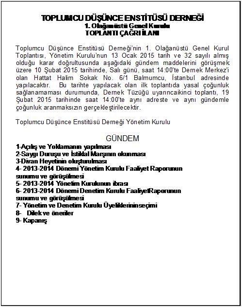 Yönetim Kurulunun 13 Ocak 2015 tarihinde aldığı 32 sayılı kararla 1. Olağanüstü Genel Kurul, Enstitü merkezinde 10 Şubat 2015 tarihinde yapılacaktır. Yasal çoğunluğun bulunamaması halinde tüzük gereği 2. toplantı 19.Şubat 2015 tarihinde gerçekleştirilecektir.